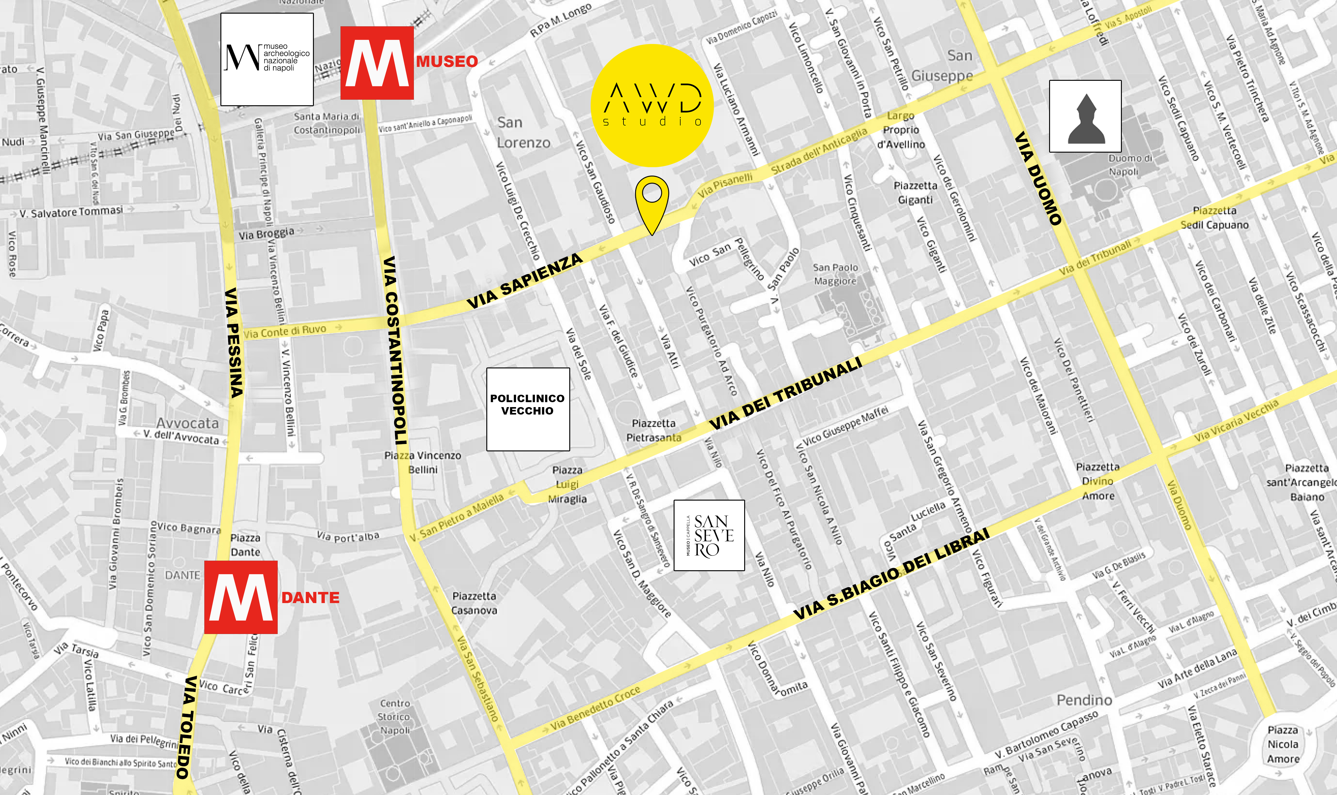 Lo studio si trova a ridosso di Largo Regina Coeli, di fronte alla chiesa di Santa Maria Regina Coeli, tra via Atri e via Sapienza, cuore pulsante del centro storico di Napoli. A 5 minuti a piedi sia dalla fermata della Metro Dante che Museo della Linea 1 e a 7 minuti a piedi dalla fermata della Metro Cavour della linea 2.